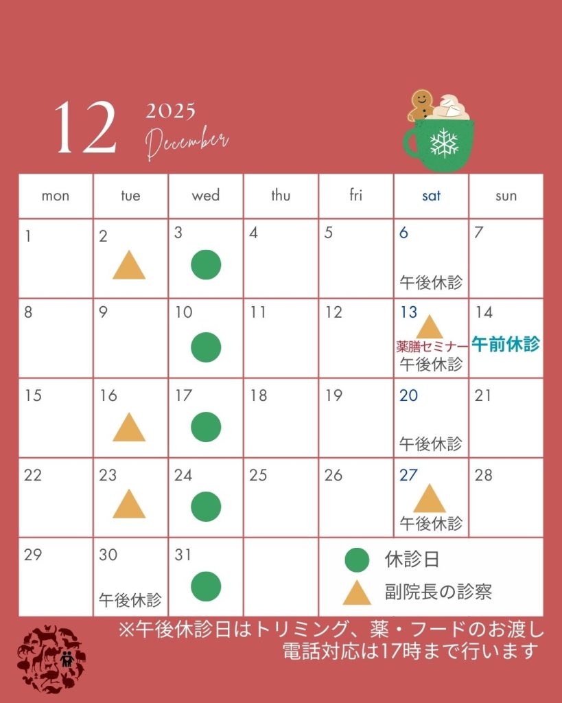 12月30日(火)は午前診察のみ(土・日祝と同じくトリミング、お薬、フードのお渡し、電話対応は通常通り17時まで看護師で行います✨)